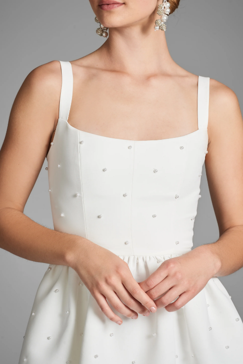 Add some fun to your bridal wardrobe with the Quinn. Our signature fit-and-flare mini is made all the more special with all-over pearl embellishment. Classic meets trend with the Quinn, ensuring this is one you reach for time and again after your wedding weekend.