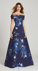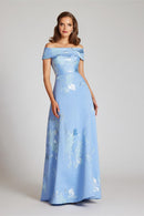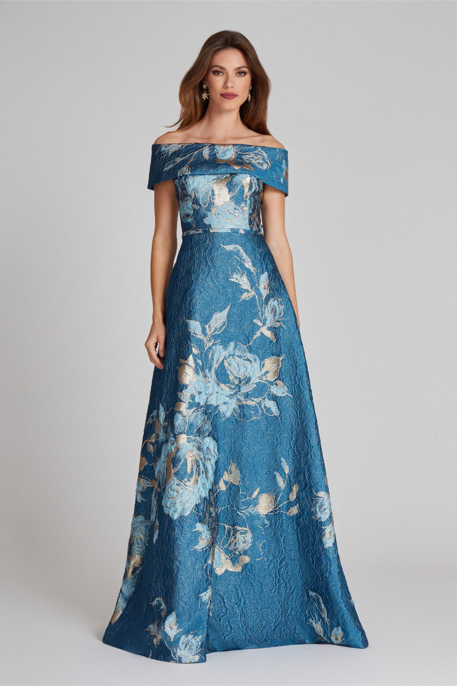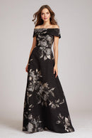 Say hello to our large floral pattern jacquard gown featuring an off-the-shoulder neckline, perfectly framing the décolletage, and an A-line skirt that flows gracefully to the floor. This dress radiates sophistication and romance.