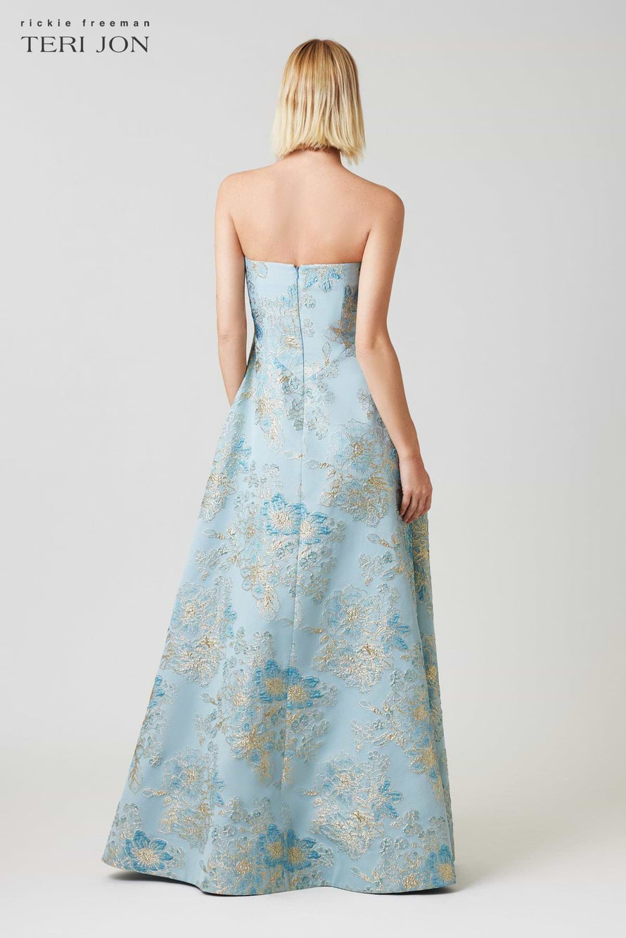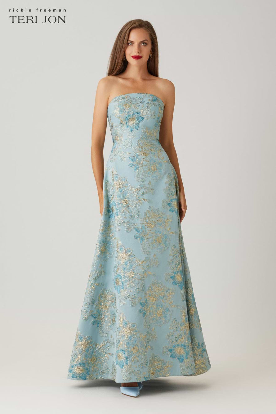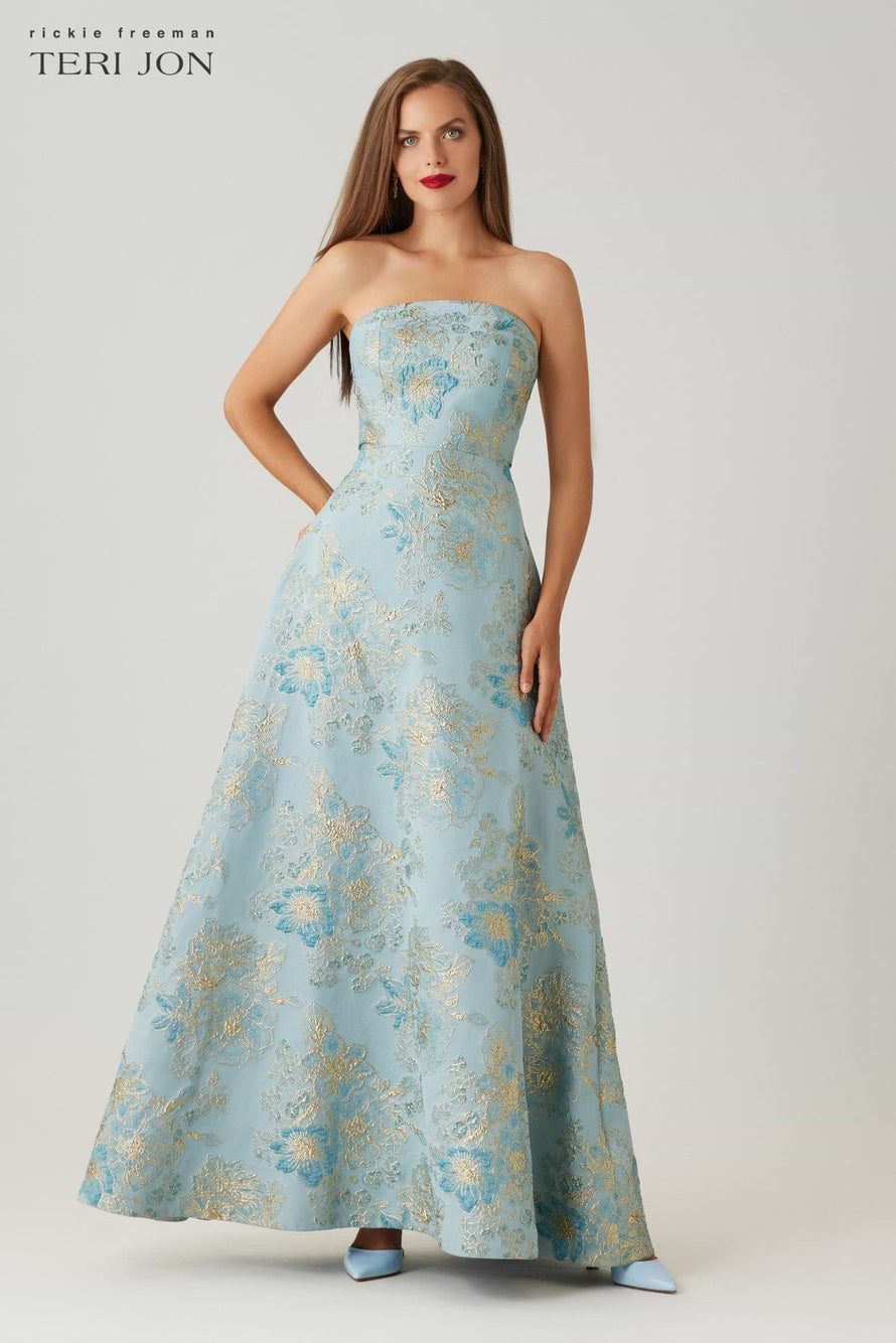 Dazzle at any event in this metallic jacquard evening gown! This dress checks all the boxes with its alluring sleeveless neckline, fitted bodice, and full a-line skirt. Designed in a glittering multi-colored pattern perfect for formal occasions. Pair with gold metallic heels to best complement this dress.